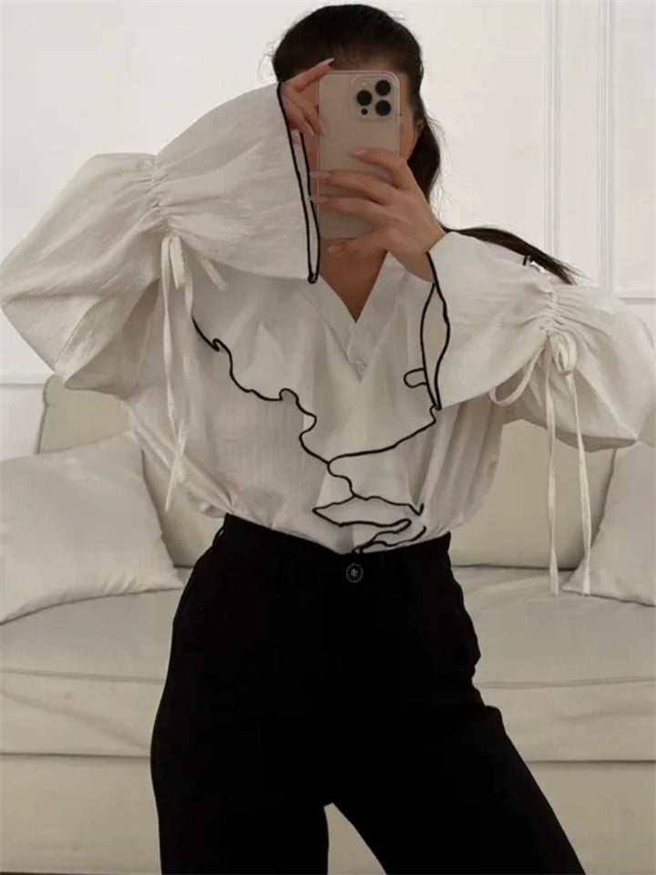 Women's French Style White Contrast Trim Ruffled V-Neck Blouses