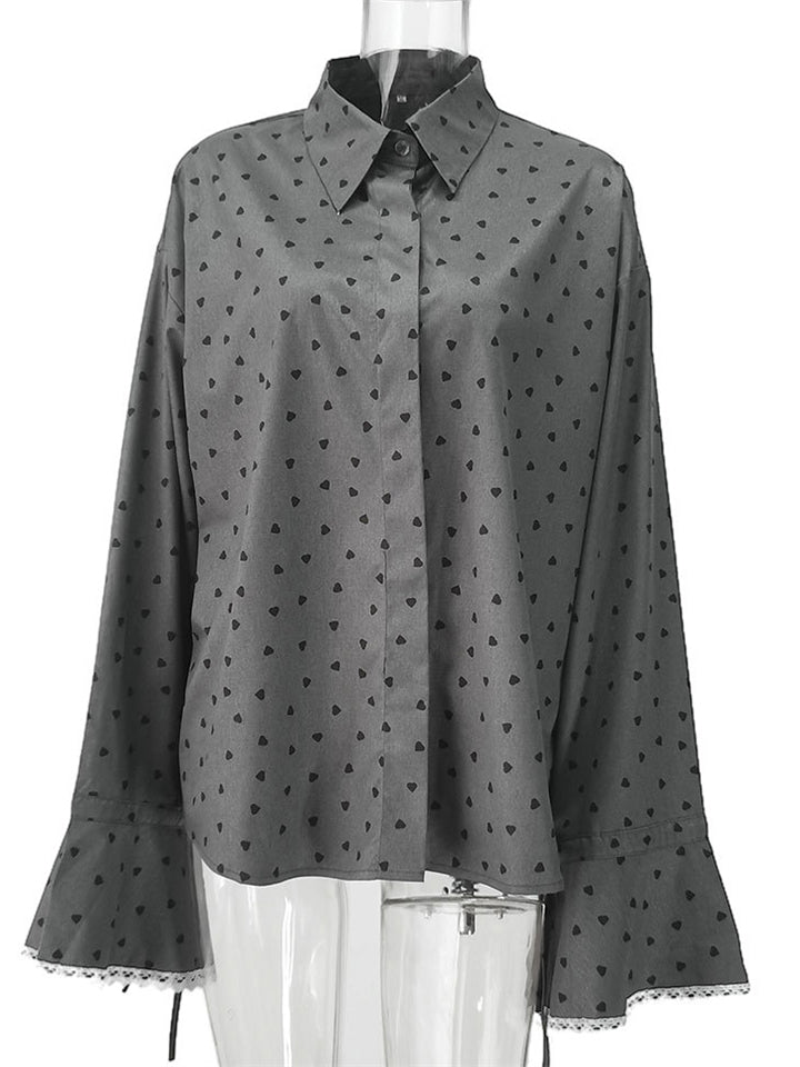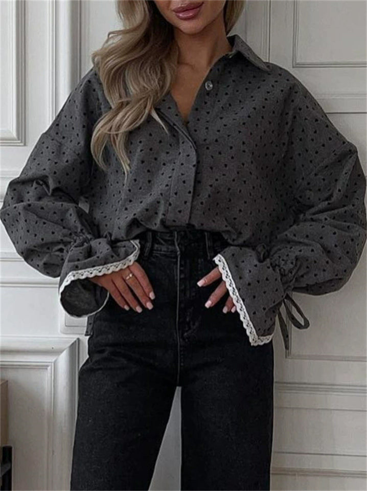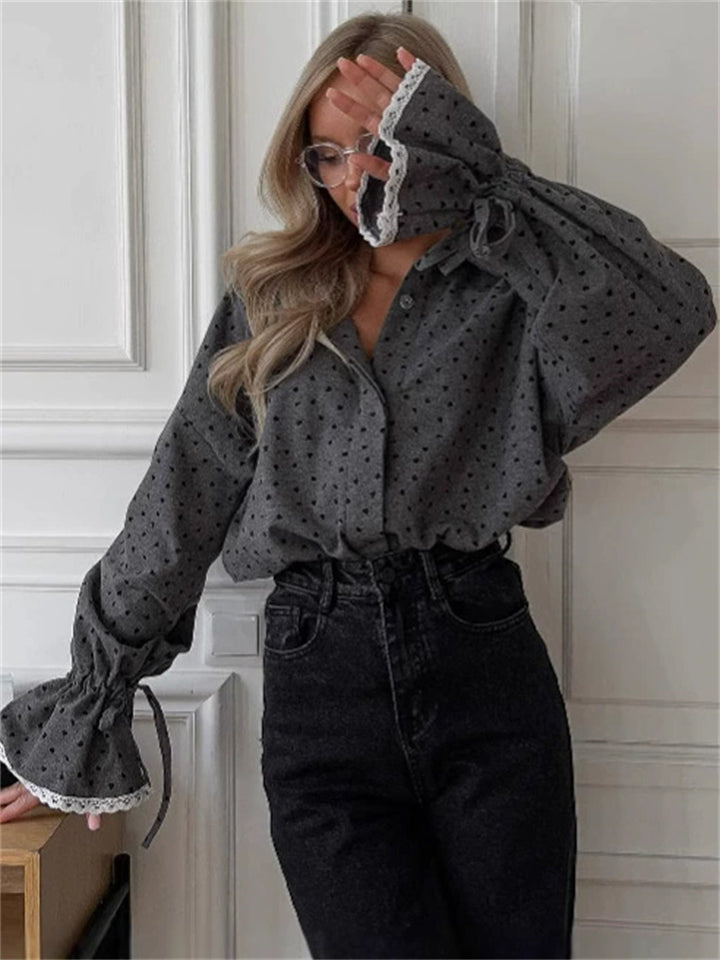 Women's Gray Polka Dot Ruffled Sleeve Blouses with Lace Cuffs