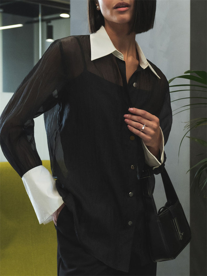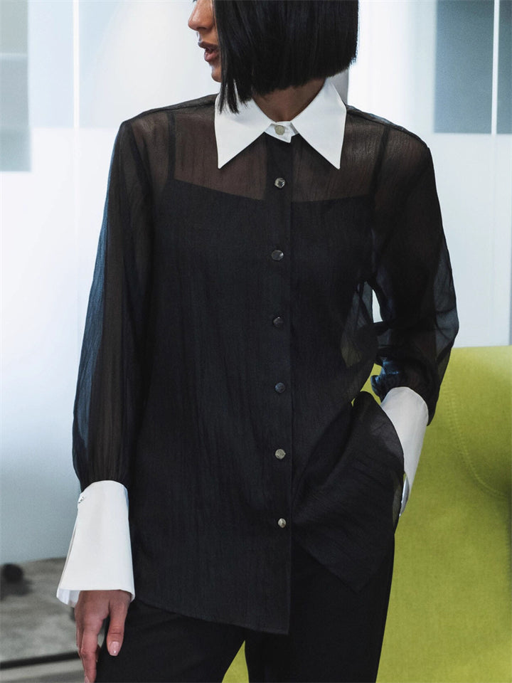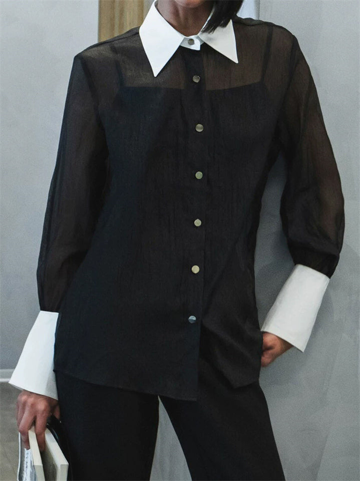 Women's Spring Chic Vintage Contrast Collar See-Through Blouses