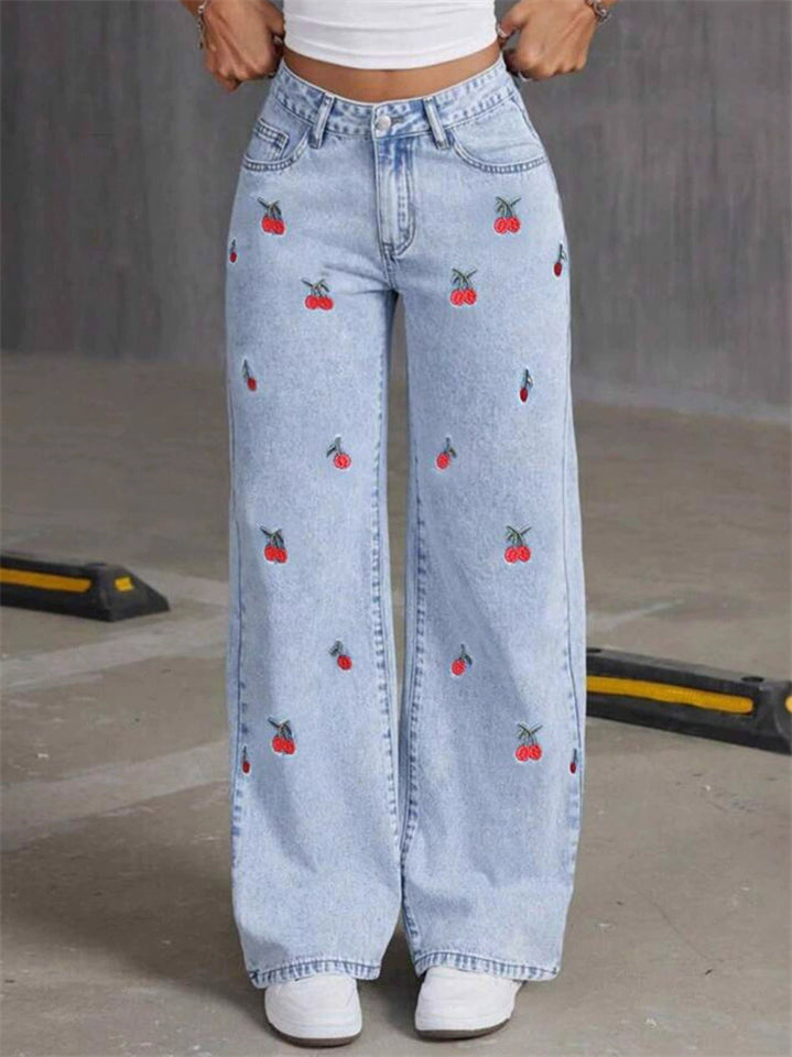 Women's Light Blue Cherry Embroidered Denim Pants High-Waist Loose Fit