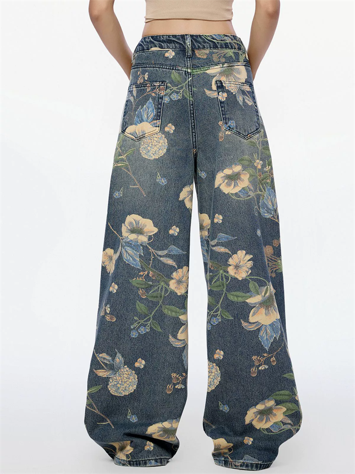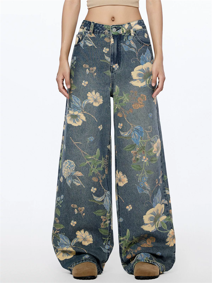 Women's Mid Waist High Street Floral Print Loose Fit Wide Leg Denim Pants