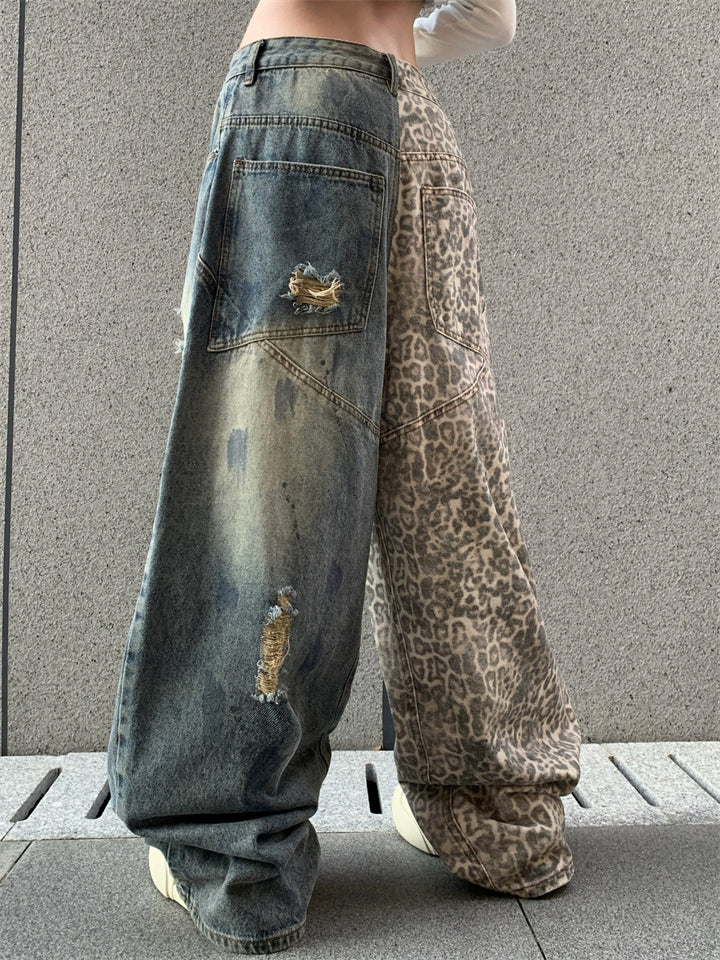 Men's Streetwear Loose Fit Leopard Print Ripped Denim Pants