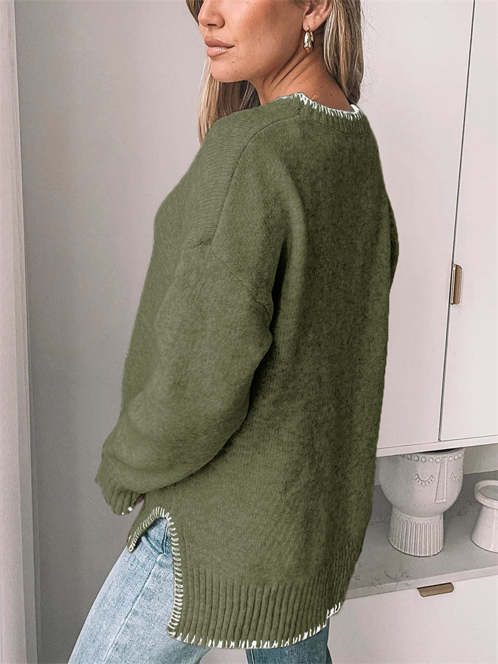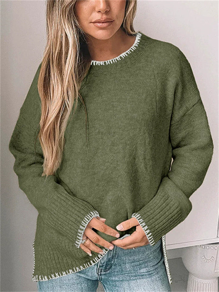 Women's Autumn Simple Commuter Contrast Trim Round Neck Asymmetric Hem Sweater