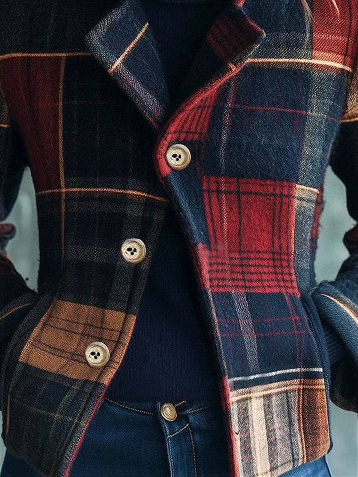 Women's Autumn Retro Color Block Plaid Stand Collar Single Breasted Coats