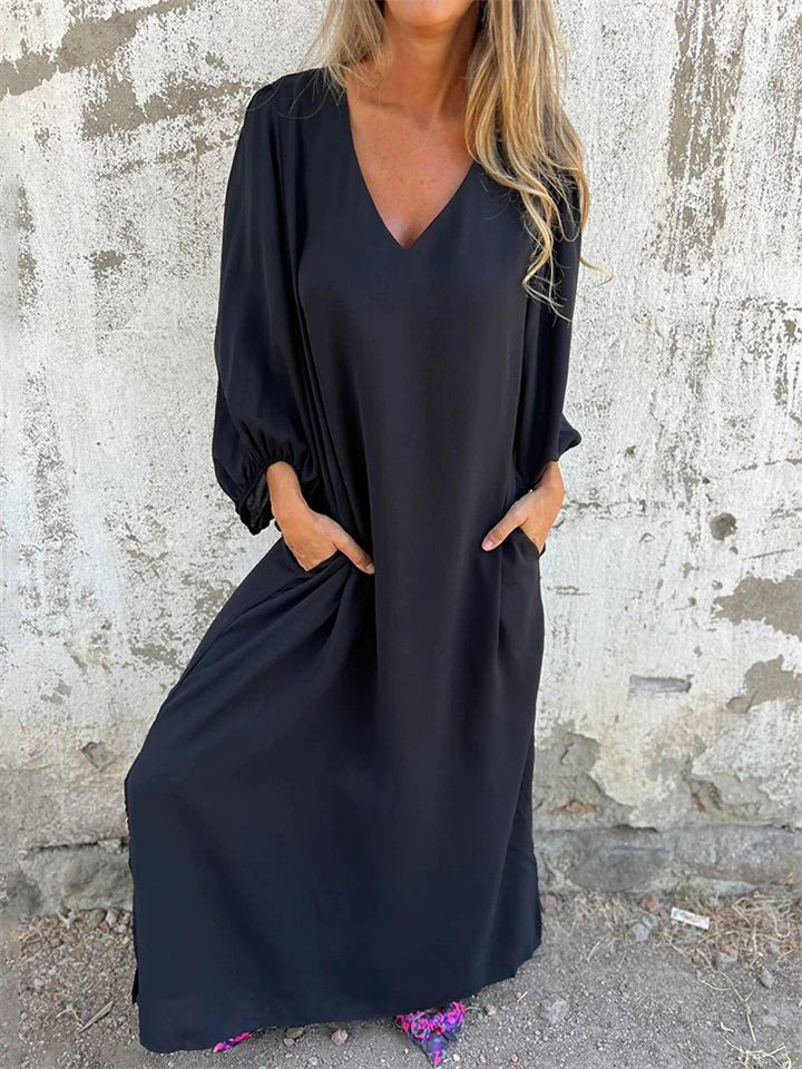 Women's Autumn Casual Loose V-neck Solid Color Lantern Sleeve Dress – ModaSharp
