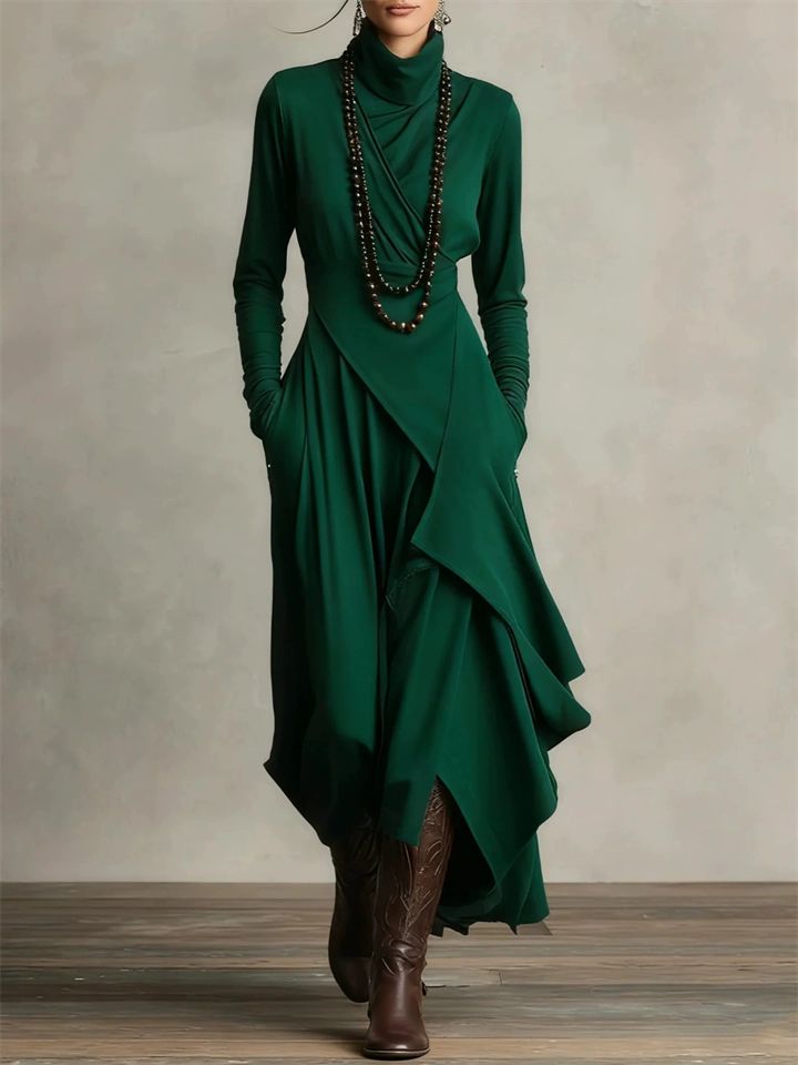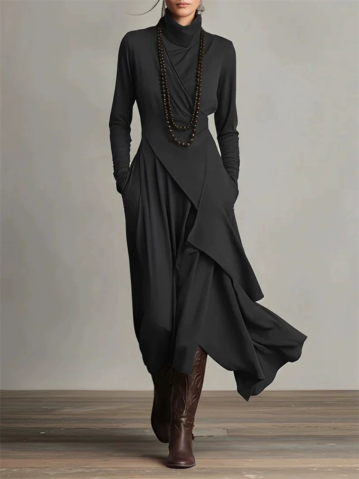 Women's Elegant Casual Long Sleeve High Neck Asymmetric Maxi Dress