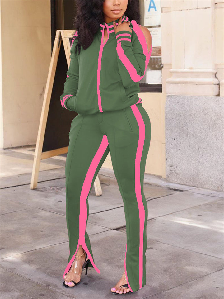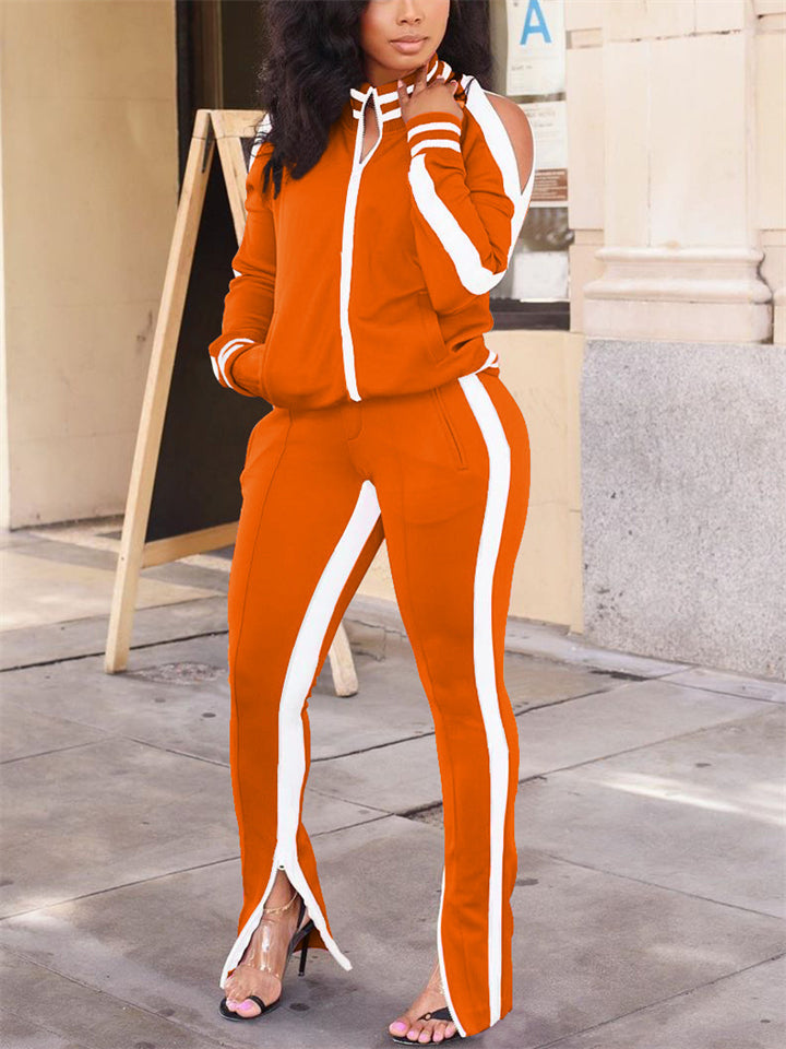 Women's Autumn Contrast Color Stripe Fitted Off Shoulder Sports Tracksuit