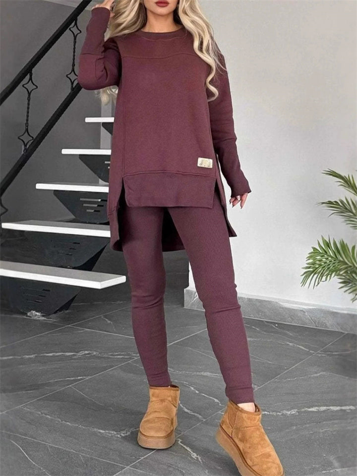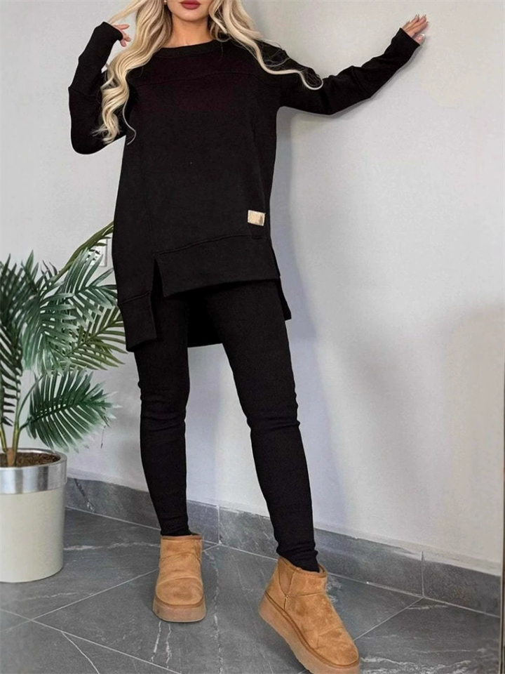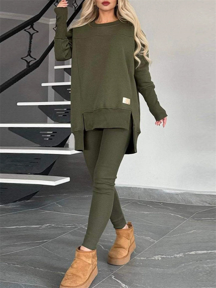 Women's Simple Casual Solid Color Round Neck Asymmetric Hem Sweatshirts & Sweatpants Outfit