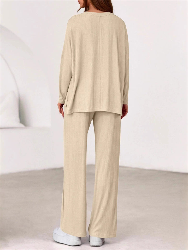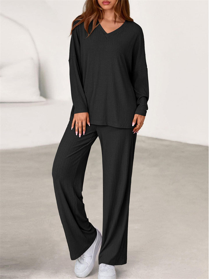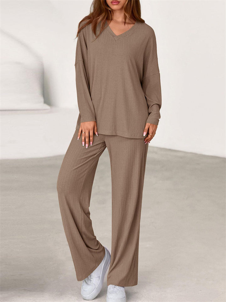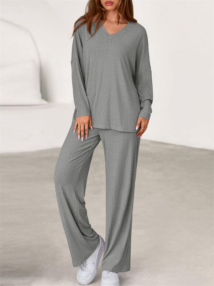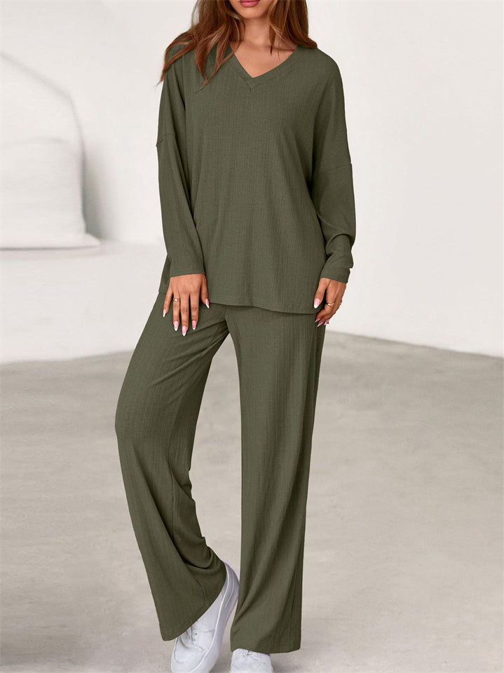 Women's Simple V Neck Long Sleeve Loose Fit Comfy Top and Pants Set