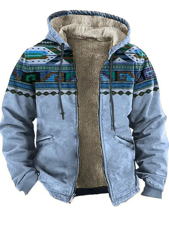 Men's Fleece Lined Zip Up Hooded Coat with Ethnic Style Print