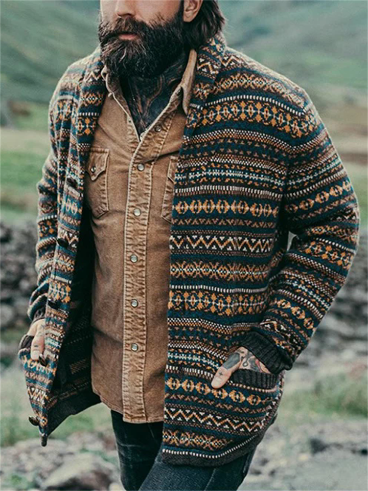 Male Retro Turn-down Collar Button Up Jacquard Sweater