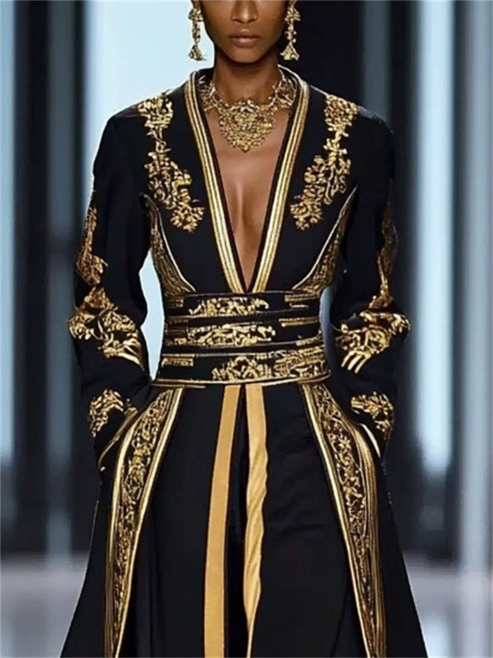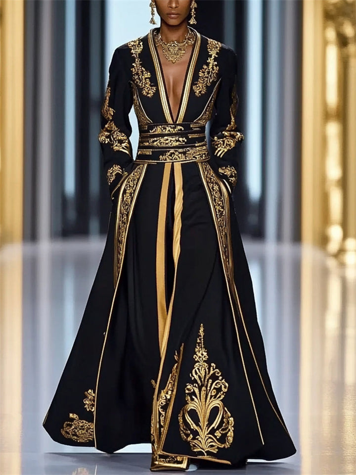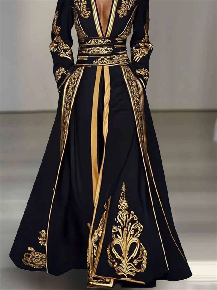 Women's Black Contrast Color Printed Slim Fit V Neck Maxi Dress