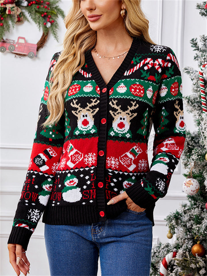 Women's Autumn Christmas Pattern V Neck Long Sleeve Cardigan Sweaters