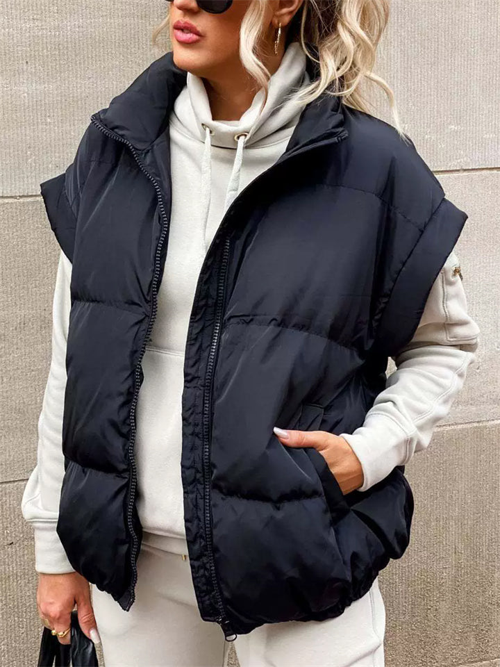 Women's Casual Solid Color Zip Up Pockets Stand Collar Sleeveless Vest Padded Coats