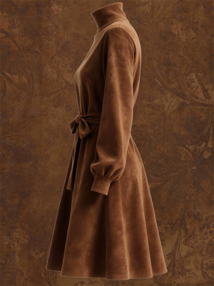 Casual Suede Turtleneck Dress for Women with Belt and Puff Sleeves