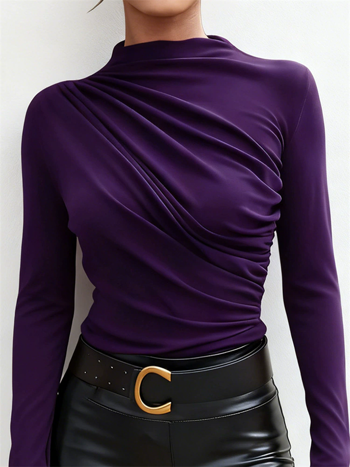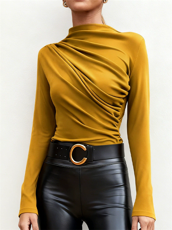 ‌Women's Elegant Pleated Slim Fit High-Neck Ruched Long Sleeve Shirts – ModaSharp
