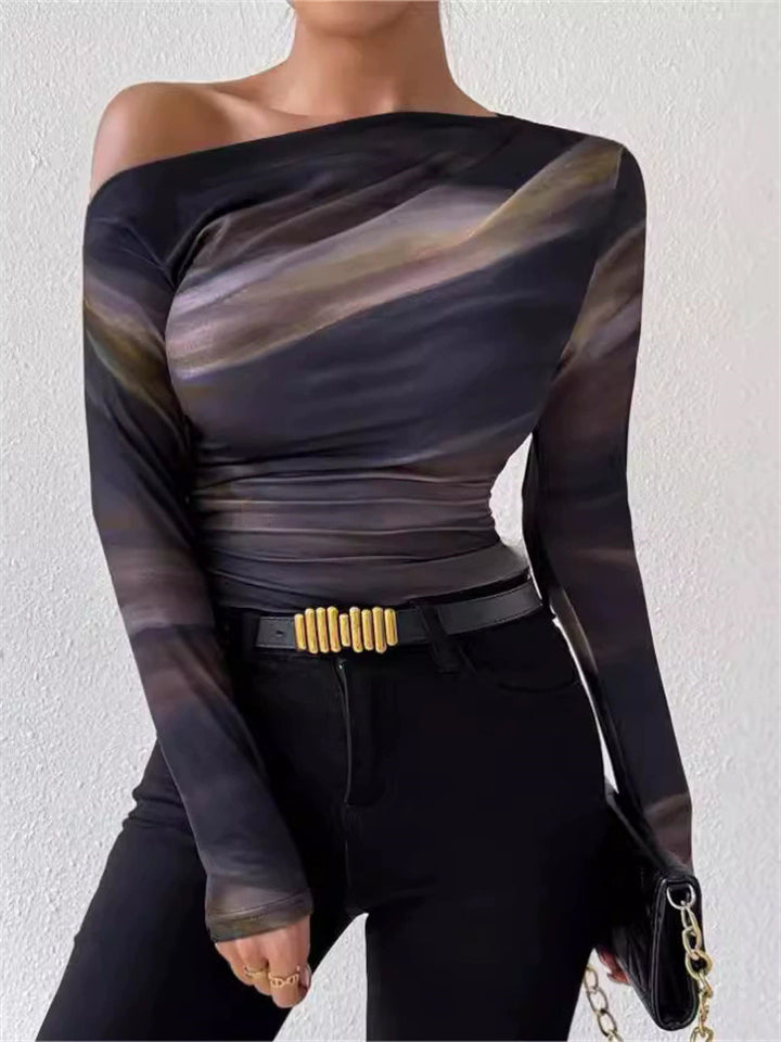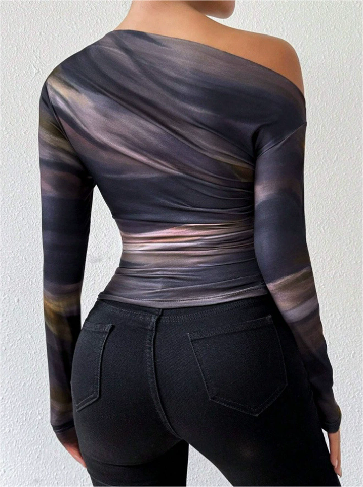 Women's Marble Print Off One-Shoulder Long Sleeve Shirts