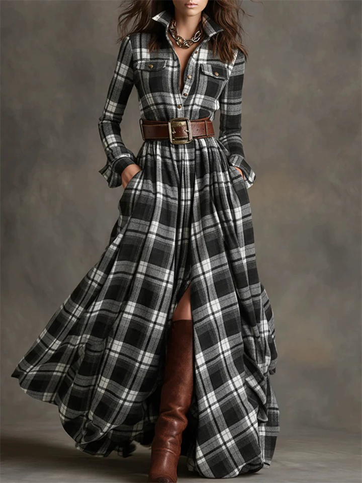 French Style Vintage Buttons Plaid Maxi Shirt Dress for Women