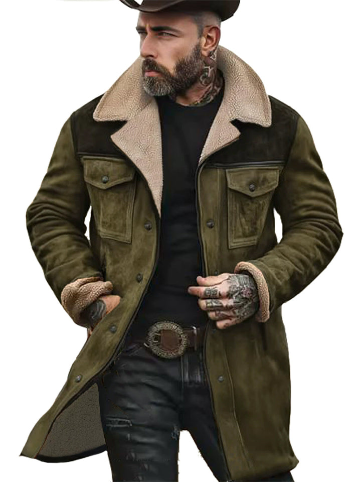 Men's Autumn Contrast Color Faux Suede Fleece Lined Jacket with Pockets