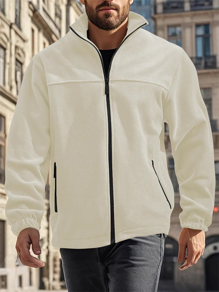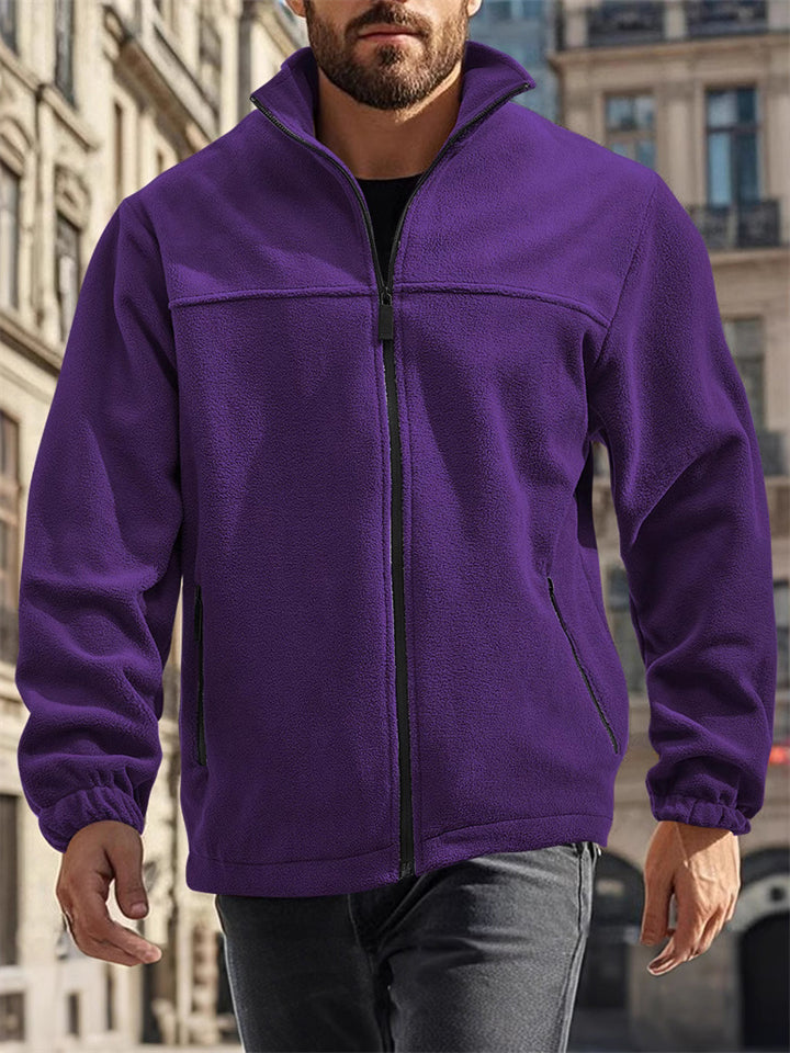Men's Simple Casual Solid Color Zipper Stand Collar Fleece Coats