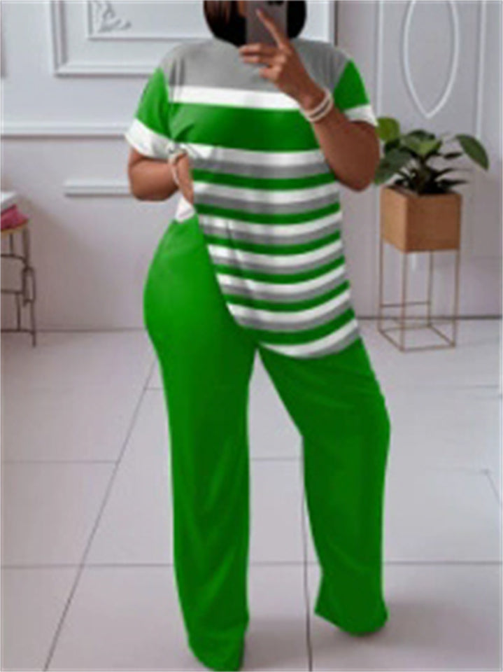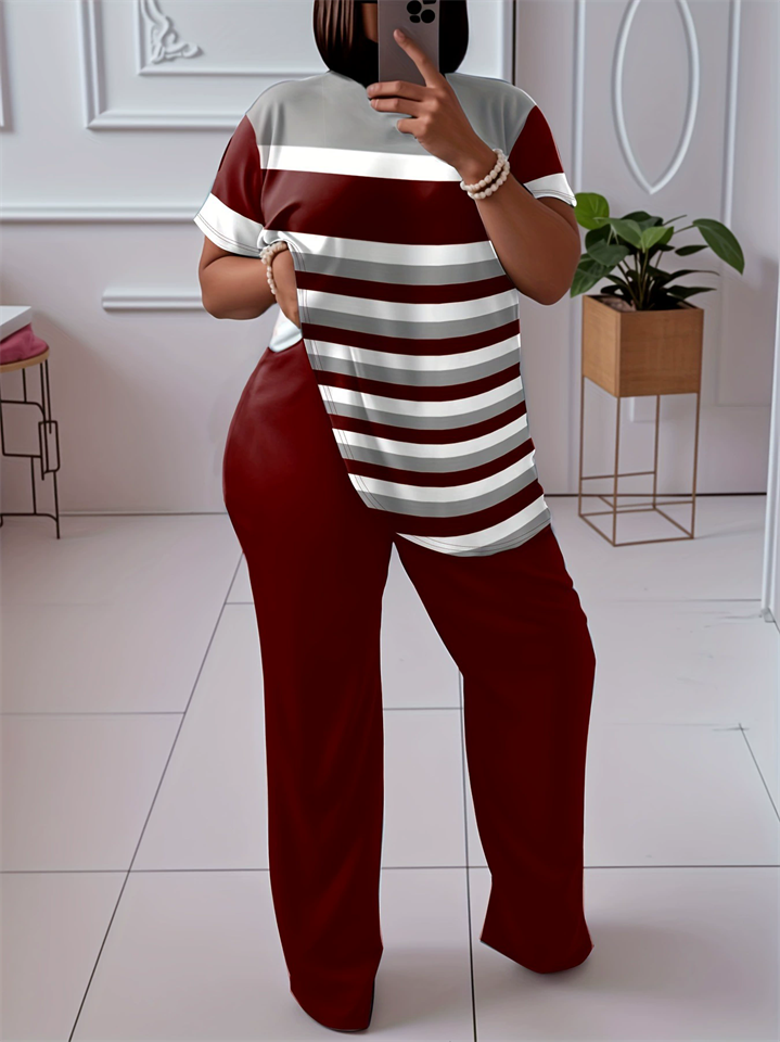 Plus Size Women's Loose Fit Color Block Striped Short Sleeve Shirt and Pants Set
