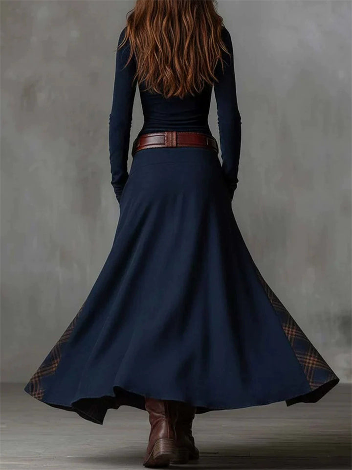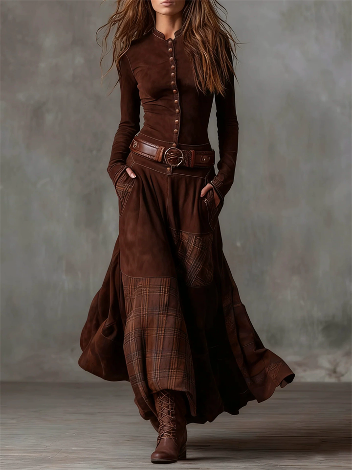 Vintage Style Stand Collar Plaid Patchwork Long Dress for Women