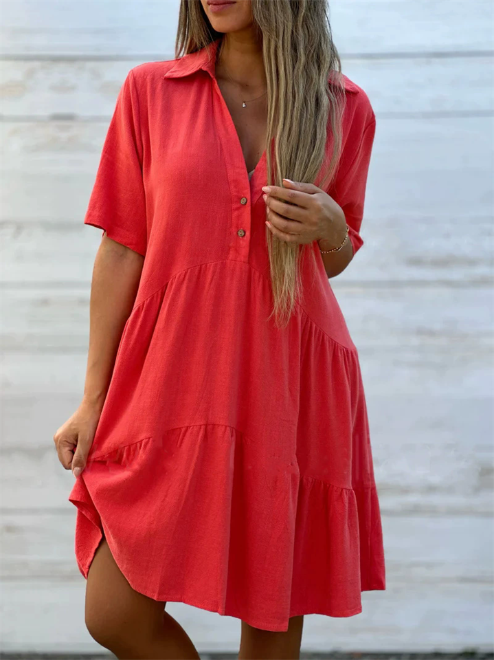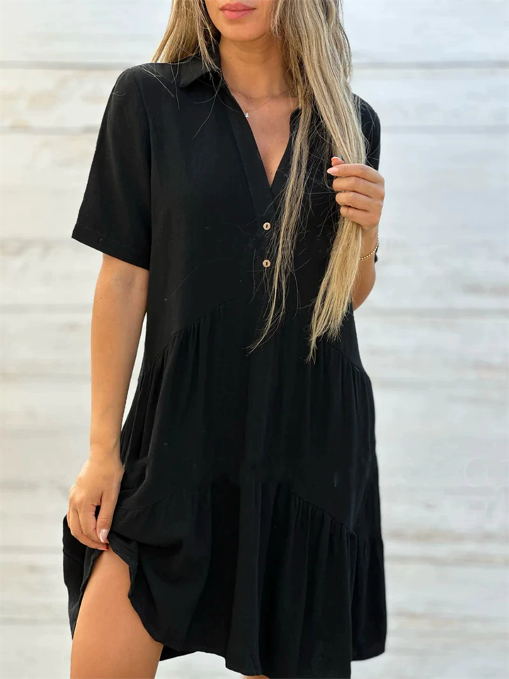 Women Casual Loose V Neck Short Sleeve Tiered Shirt Dress