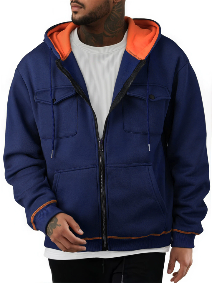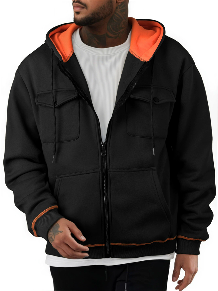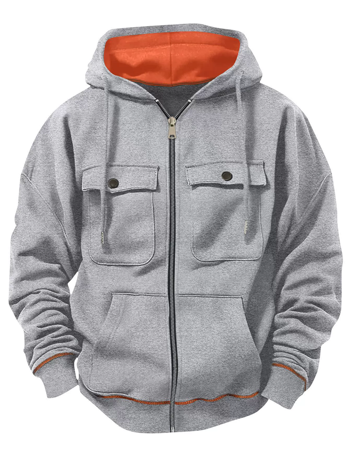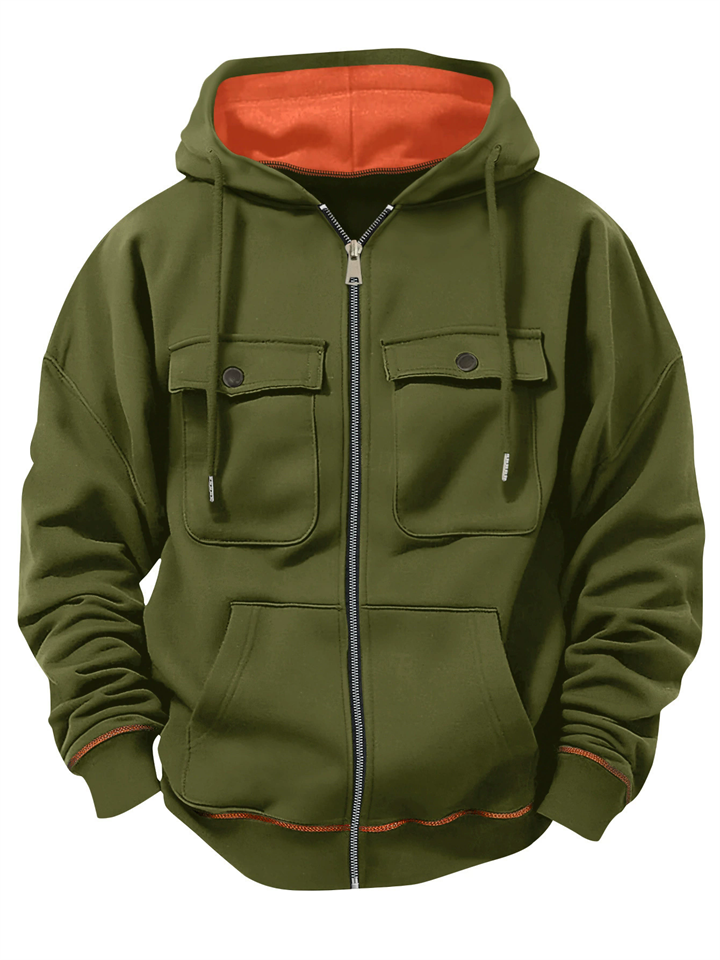 Men's Autumn Fleece Zipper Long Sleeve Cargo Pockets Cardigan Hoodie