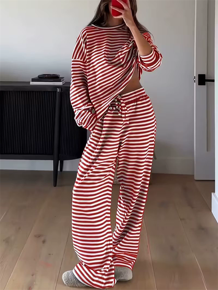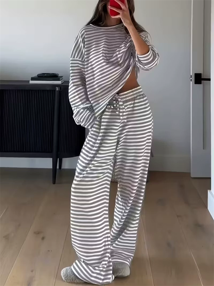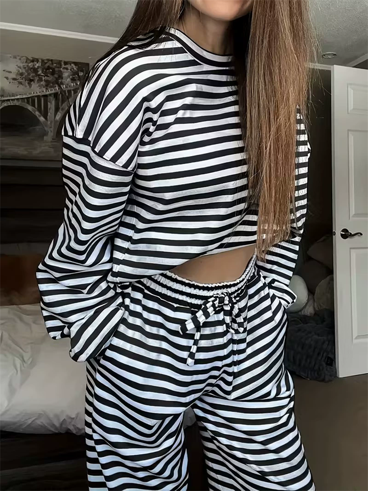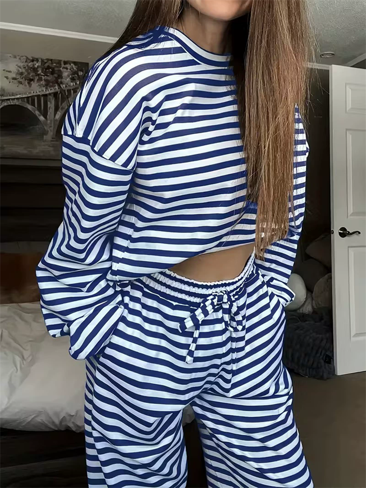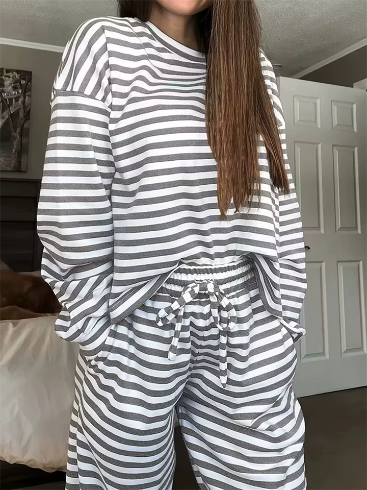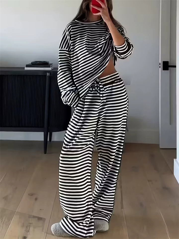 Women's Comfy Round Neck Striped Loose Fit Casual Top and Drawstring Pants Set