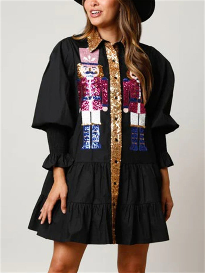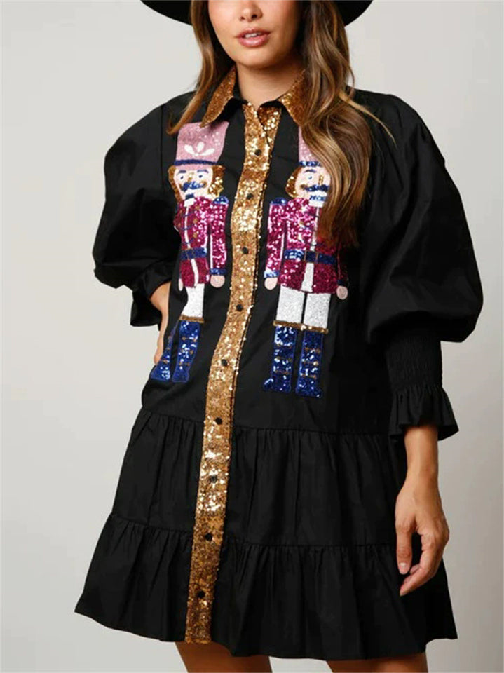 Women's Contrast Color Sequined Long Sleeve Lapel Shirt Dress