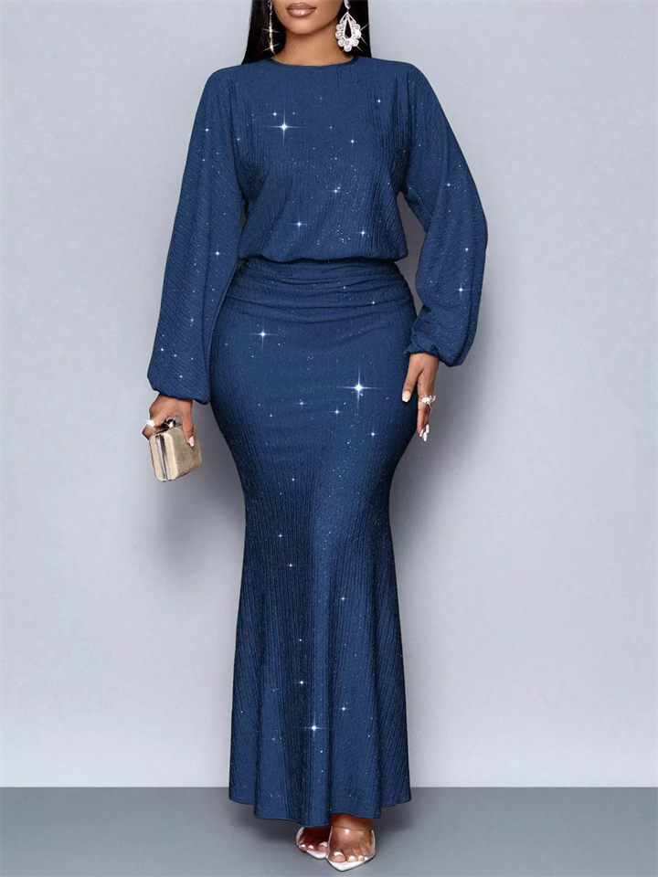 Women's Elegant Glitter Long Sleeve Pleated Fishtail Maxi Evening Dresses