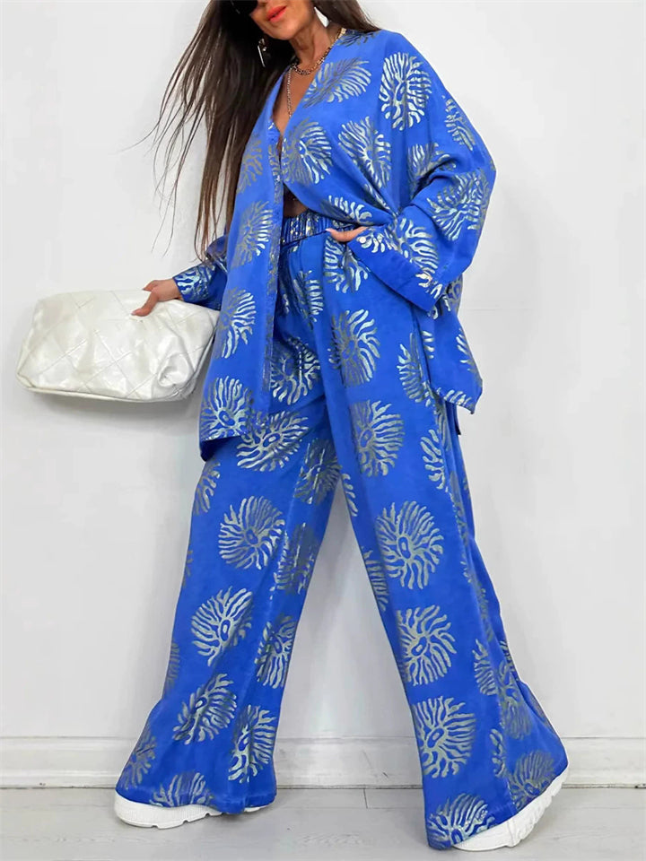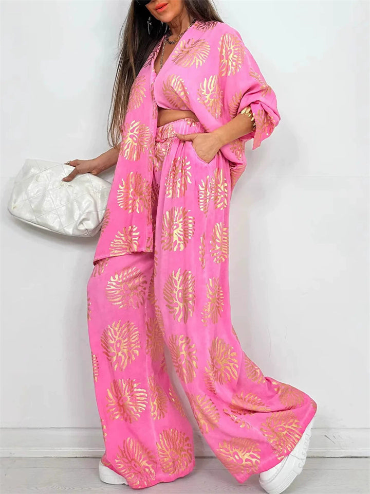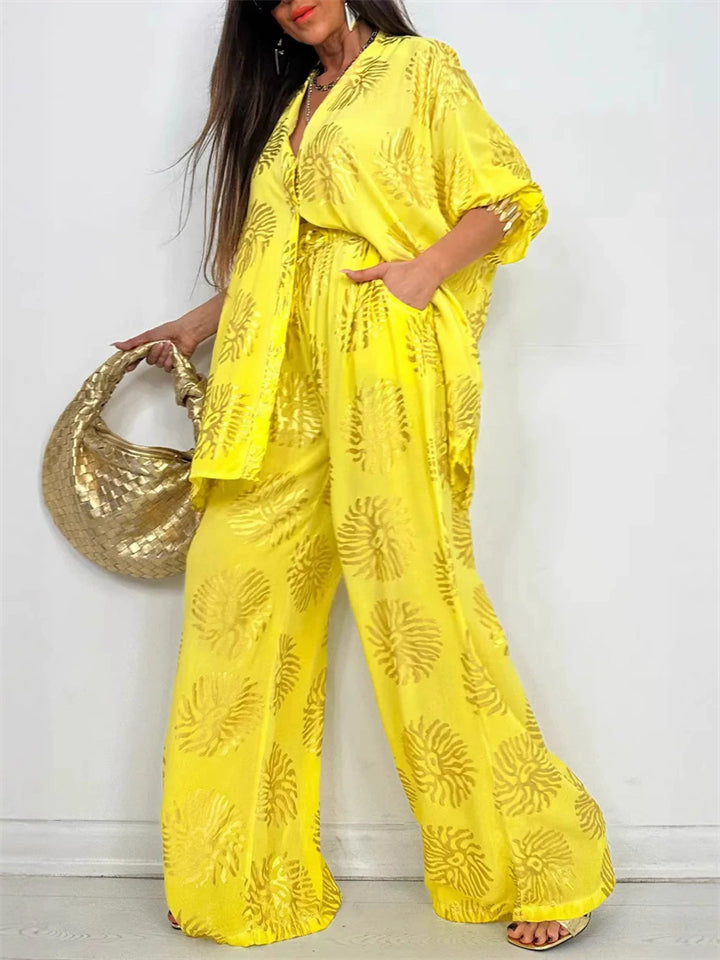 Women's Gold Floral Print Button Up Loose Fit Top and Wide Leg Pants Set