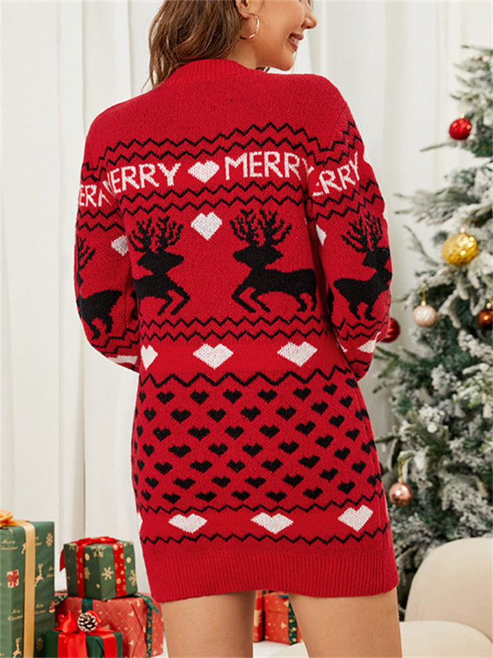 Women's Red Elk Jacquard Long Sleeve Sweater Mini Dress