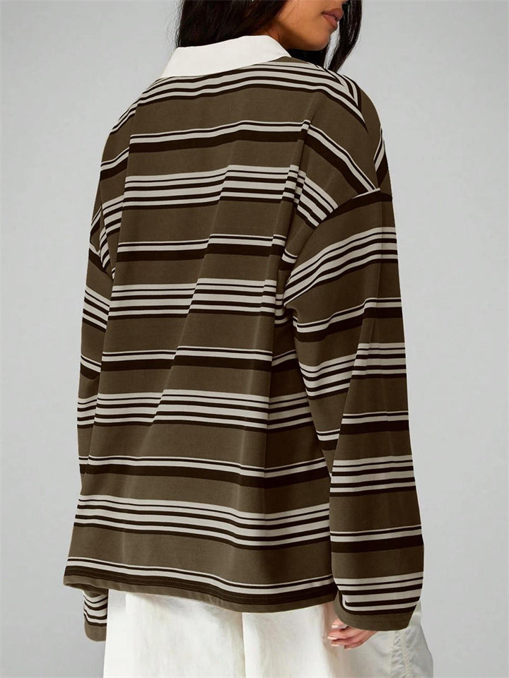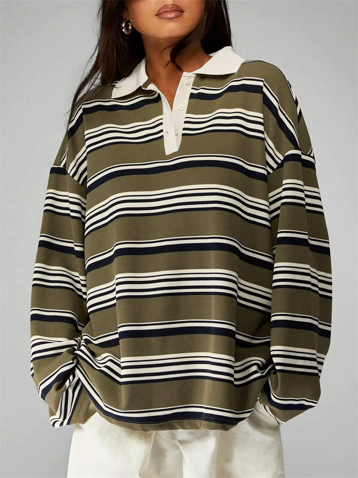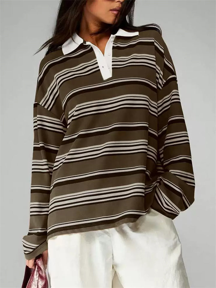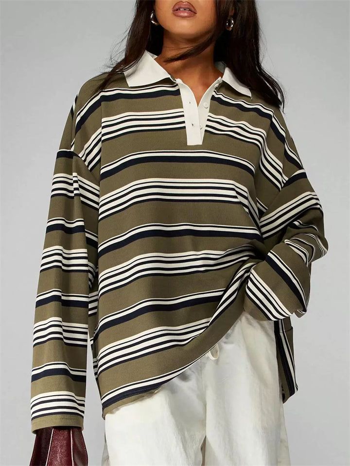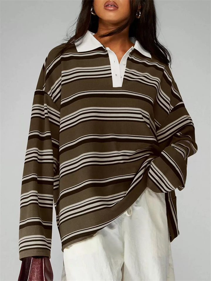 Women's Striped Rugby Shirt Long Sleeve Oversized Polo Top