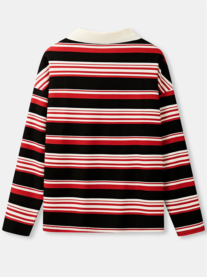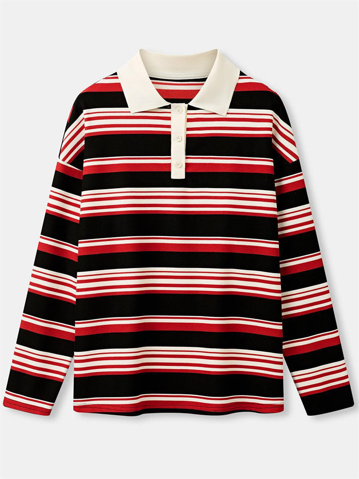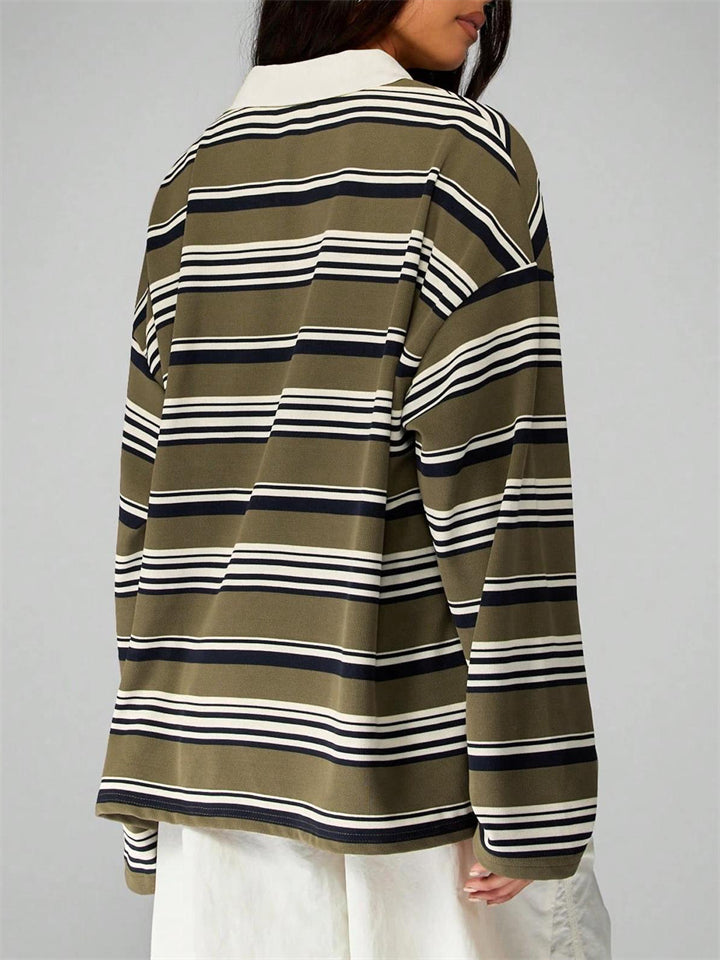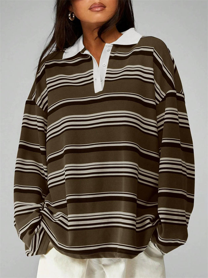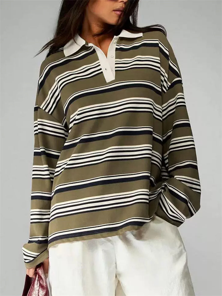 Women's Striped Rugby Shirt Long Sleeve Oversized Polo Top